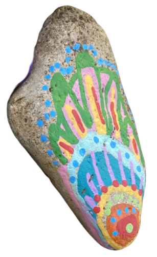 The hearts, spirals, leaves, and bright colors on each rock were designed by student and staff artists.